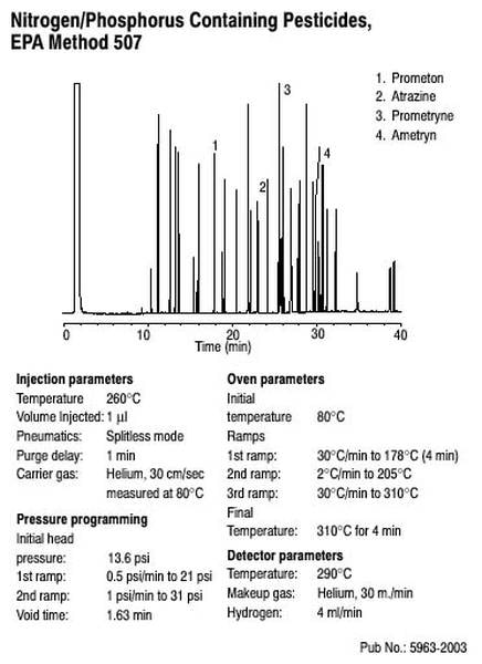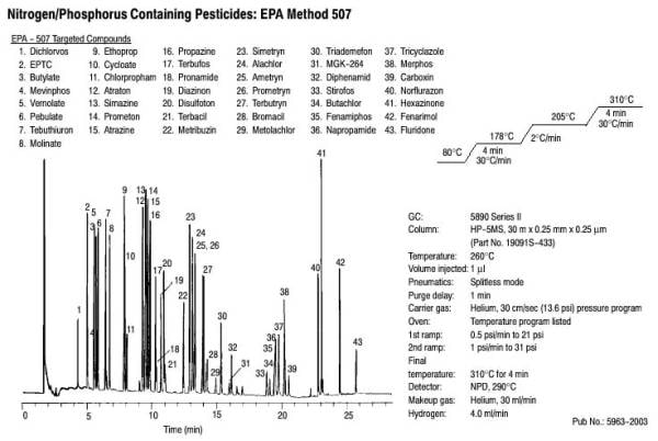 Gas chromatography with an Agilent J&W CP-Sil 8 CB Low Bleed/MS column separates 19 pesticides and herbicides according to EPA 507 in 28 minutes.